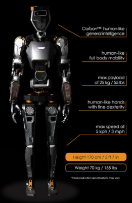 Human-like hands with 20 DOF each, teleoperation capability, Carbon AI for autonomous learning
